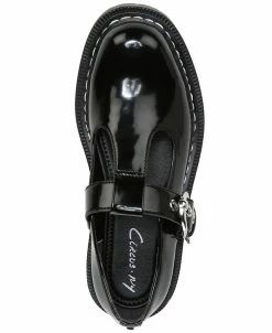 - Round-toe T-strap Mary Jane loafer flats with adjustable buckle closure