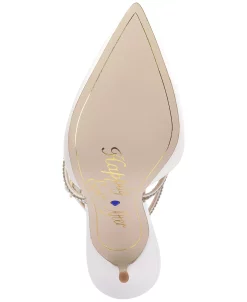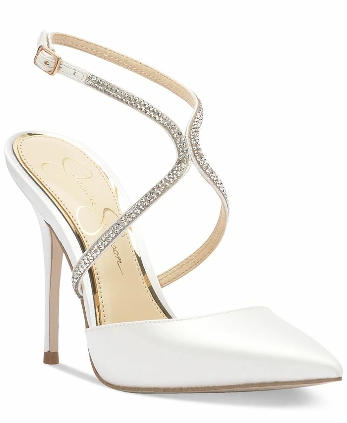 Satin pointed toes and glittering straps enhance a pretty silhouette in the sleek stiletto lift of Jessica Simpson’s Weyemia pumps.